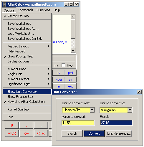 Quick Unit Conversions. The Unit Converter lets you work out calculations for standard conversions. Suppose you want to find out the fuel economy of an engine in miles per gallon but you only have the performance figures for kilometers per liter. The unit converter will give you an instant answer. Choosing the units to convert to and from and the value to convert, simply clicking the Convert button gives an instant answer. In our example, 11.56 kilometers a liter converts to27.19 miles a gallon. |