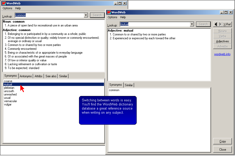 If you want to look up a related word, nothing could be simpler. For example, if you want to compare the definitions of "common" and "mutual," you only have to click on the synonym for mutual.