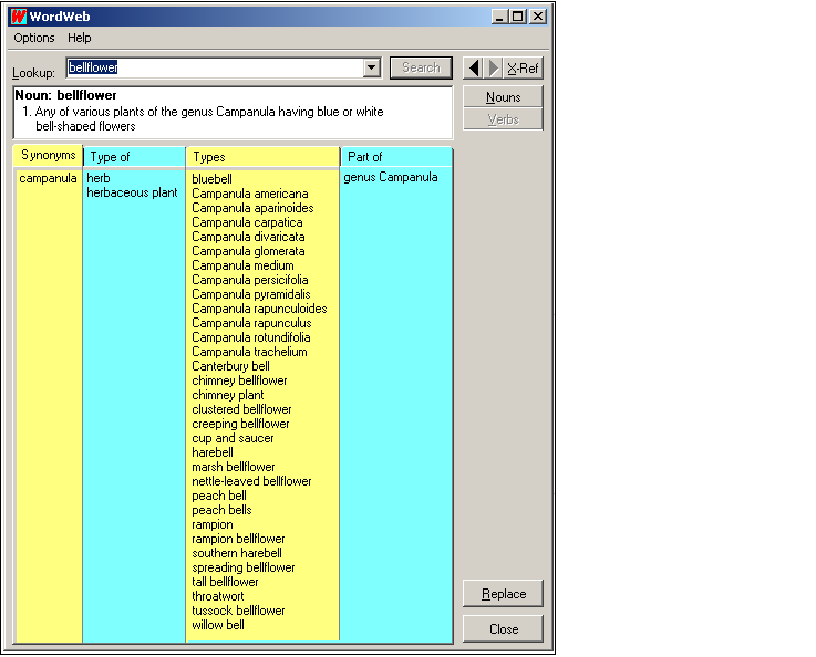 Wonderful Databases of Information. Let's have a look at the extent of the database in the dictionary and thesaurus. For example, suppose you wanted to look up the word "bellflower." You simply type it in to WordWeb and click the search button. As well as the dictionary definition of the word, the thesaurus shows the synonym for "bellflower," that it is a type of herbaceous plant, its 30 scientific and common names and its scientific classification. |