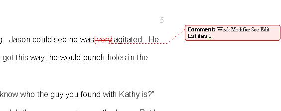 Ghost Reviewer® checks your document for weak modifiers, clichés, misused words, wordy phrases, and more. Using Word's Track Revisions function, she highlights the indiscretions and points to the explanation.