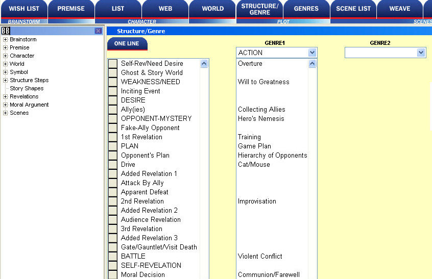 If you have one or more of the Genre Add-ons, the Structure/Genre form shows you the genre's story beats along with the Structure Steps. You can see the story beats of up to two genres.