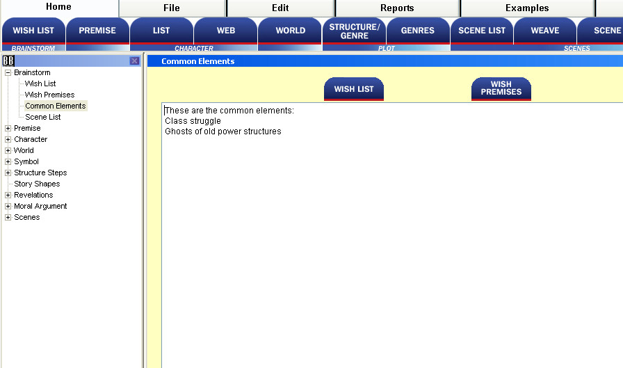 The Common Elements form lets you detail the common or repeating story elements you wrote in Wish List and Wish Premises.