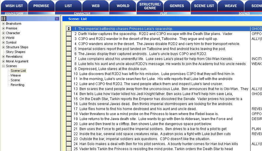 The Scene List shows you a 1-line description of every scene in your story, along with the scene's structure step.