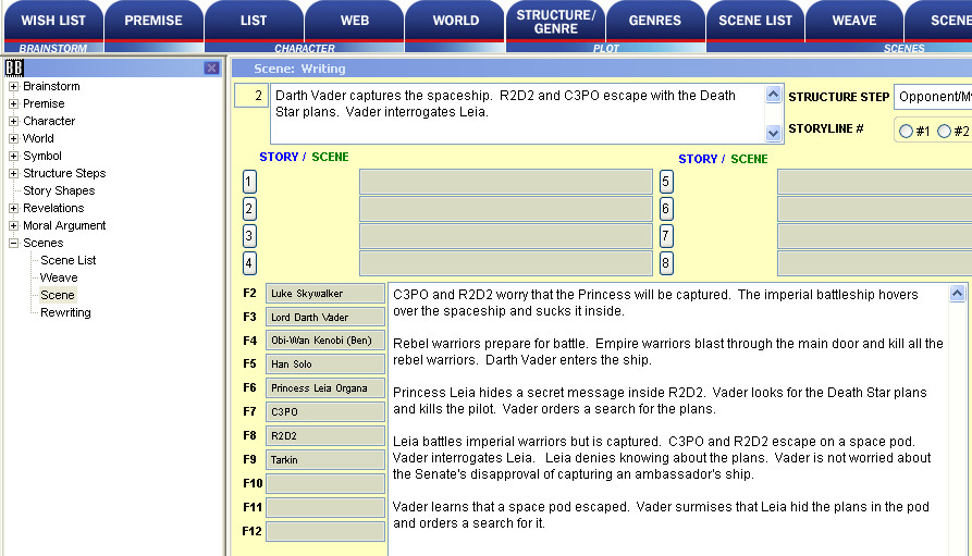 Write your story, including dialogue, in the Scene form. Click on one of eight buttons to remind you of the key story and scene elements as you are writing.