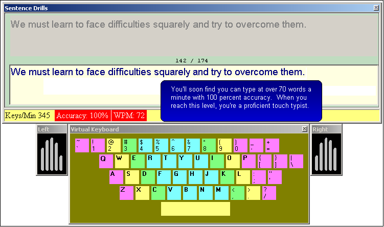 As you progress through the typing course, you'll learn to type sentences and paragraphs. You'll soon find you can type quickly and accurately. It will probably take about 15 hours to become a proficient typist. But once you can touch-type, you'll save countless hours typing your documents. |
