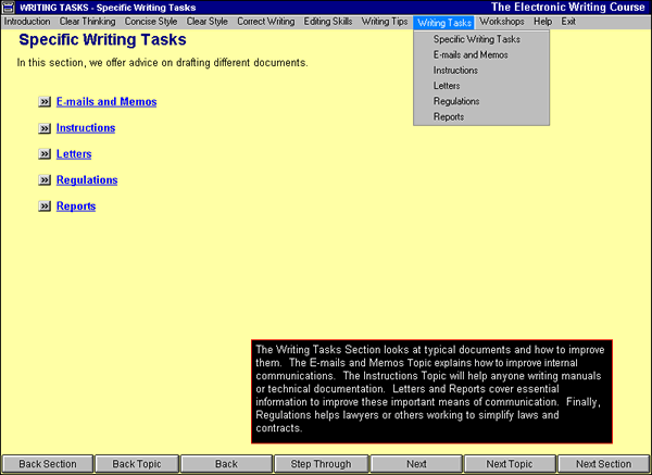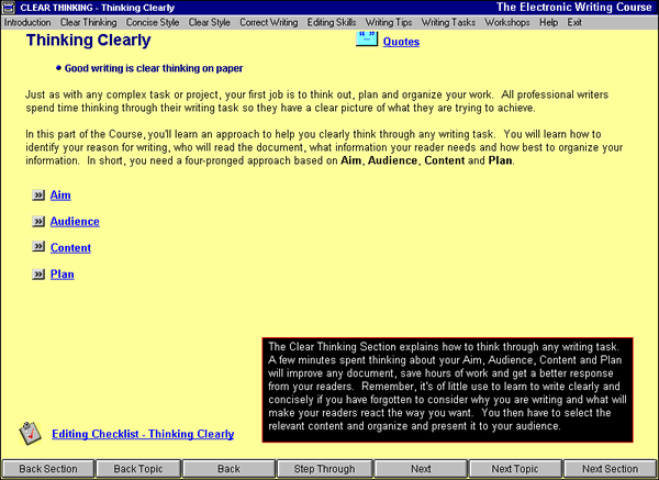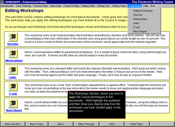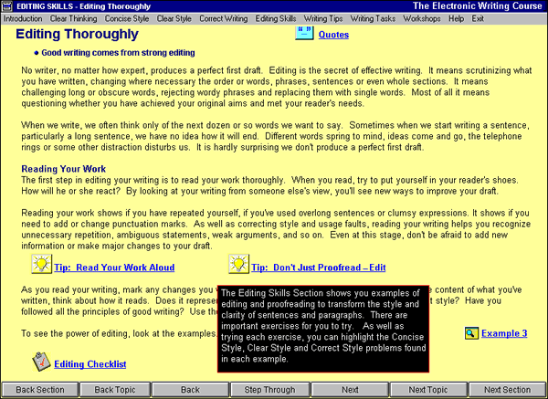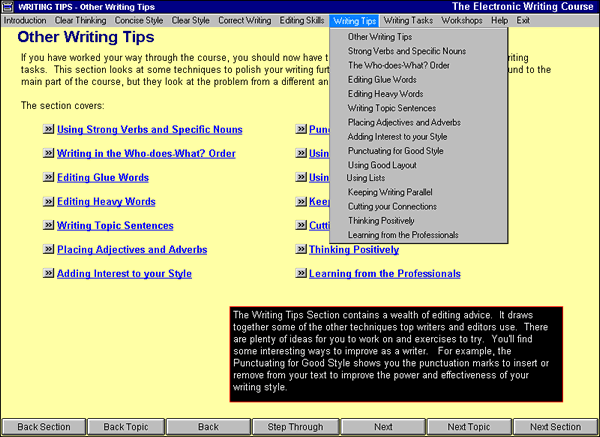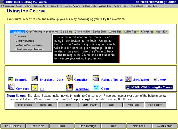The Electronic Writing Course is an intensive, self-directed, computerized program that takes about 20 hours (or about one week in a classroom setting) to complete. And it's an excellent primer for those who are going to be using StyleWriter, as StyleWriter is most effective when all its concepts and editing suggestions are fully understood.