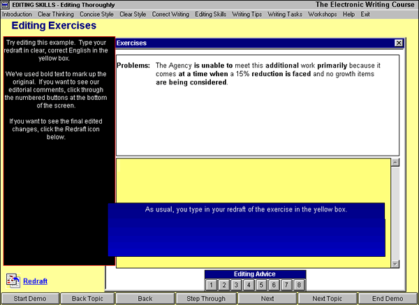 When you have drafted your answer in the yellow box, you can go through the exercise by clicking the Editing Advice buttons. These suggested changes and explanations show how each change improves the draft.